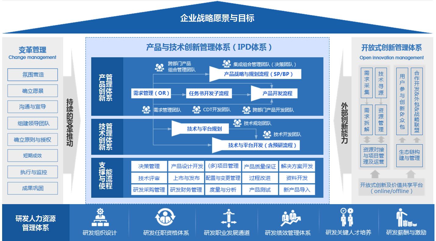研發管理(lǐ)框架是(shì)IPD(Integrated Product Development, 簡稱IPD)的(de)精髓,它代表業(yè)界最佳實踐的(de)諸多(duō)要(yào)素。其框架如(rú)下(xià)圖所示。