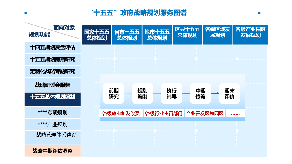 博思在”十五五”規劃中可(kě)向各級政府、開(kāi)發區(qū),提供“十四五”評估複盤,”十五五“規劃前期課題研究、基本思路(lù)研究、總體(tǐ)規劃(綱要(yào))編制(zhì)、各項專項規劃、年(nián)度計(jì)劃編制(zhì)及提供中期評估修編、期末評價的(de)全生(shēng)命周±期服務。具體(tǐ)各級政府戰略規劃框架服務內(nèi)容如(rú)圖所示: